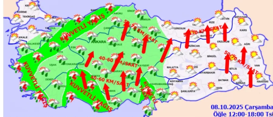 KUVVETLİ RÜZGAR UYARISI: Rüzgarın; Akdeniz'in iç kesimleri, İç Anadolu’nun güney ve doğusu, Doğu Karadeniz’in iç kesimleri ile Doğu Anadolu’nun kuzey ve doğusunda güneyli yönlerden kuvvetli olarak (40-70 km/saat) esmesi beklendiğinden, oluşabilecek olumsuzluklara (ulaşımda aksamalar vb) karşı dikkatli ve tedbirli olunması gerekmektedir.