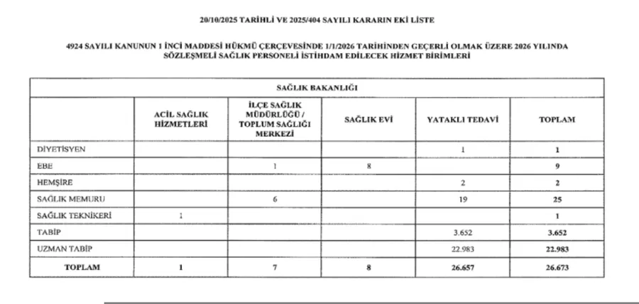 Karar kapsamında toplam 26 bin 673 sözleşmeli sağlık personeli kadrosu ayrıldı. Söz konusu kadroların içinde uzman tabiplerden, tabiplere ve diğer sağlık çalışanlarına kadar geniş bir yelpaze yer alırken özellikle yataklı tedavi kurumları başta olmak üzere -acil sağlık hizmetlerinde, ilçe sağlık müdürlüklerinde, toplum sağlığı merkezlerinde ve sağlık evlerinde- farklı unvanlarda kontenjan açıldı. Unvan bazında dağılımda; 3 bin 652 tabip, 22 bin 983 uzman tabip bulunurken, ayrıca çok daha küçük sayılarla sağlık memuru, ebe, hemşire, diyetisyen ve sağlık teknikeri gibi pozisyonlar için de kontenjan belirlendi.