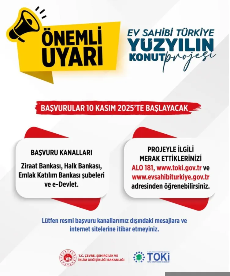 Çevre Şehircilik ve İklim Değişikliği Bakanlığı, sosyal medya hesaplarından yaptığı paylaşımda, 81 ilde 500 bin sosyal konutun inşa edileceği Yüzyılın Konut Projesi ile ilgili sosyal medyada yayınlanan sahte linkler, internet siteleri ve telefon mesajlarıyla ilgili vatandaşları uyardı. 10 Kasım’da başlayacak başvurular öncesinde uyarı ve hatırlatmalarda bulanan Bakanlık, başvuruların yalnızca T.C. Ziraat Bankası, Halk Bankası, Emlak Katılım Bankası şubeleri aracılığıyla veya e-Devlet üzerinden yapılacağının altını çizdi.