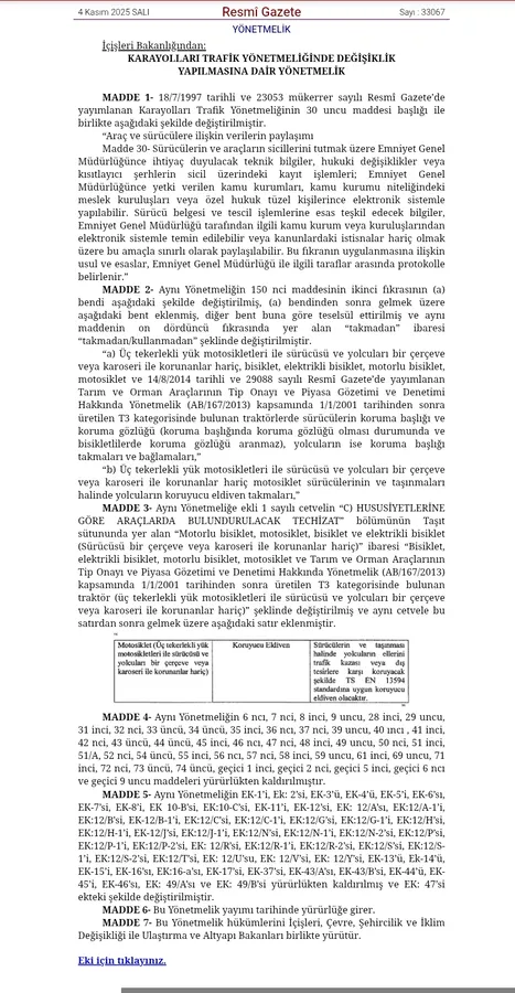 Yeni uygulama Resmi Gazete'de yayımlandı ve 4 Kasım 2025 itibarıyla yürürlüğe girdi. İçişleri Bakanlığı tarafından hazırlanan ve Resmi Gazete’de yayımlanarak yürürlüğe giren Karayolları Trafik Yönetmeliği değişikliğine göre; bisiklet, elektrikli bisiklet, motorlu bisiklet, motosiklet ve 2001 sonrası üretilen T3 kategorisindeki traktör kullanıcıları artık koruma başlığına ek olarak koruyucu gözlük takacak.