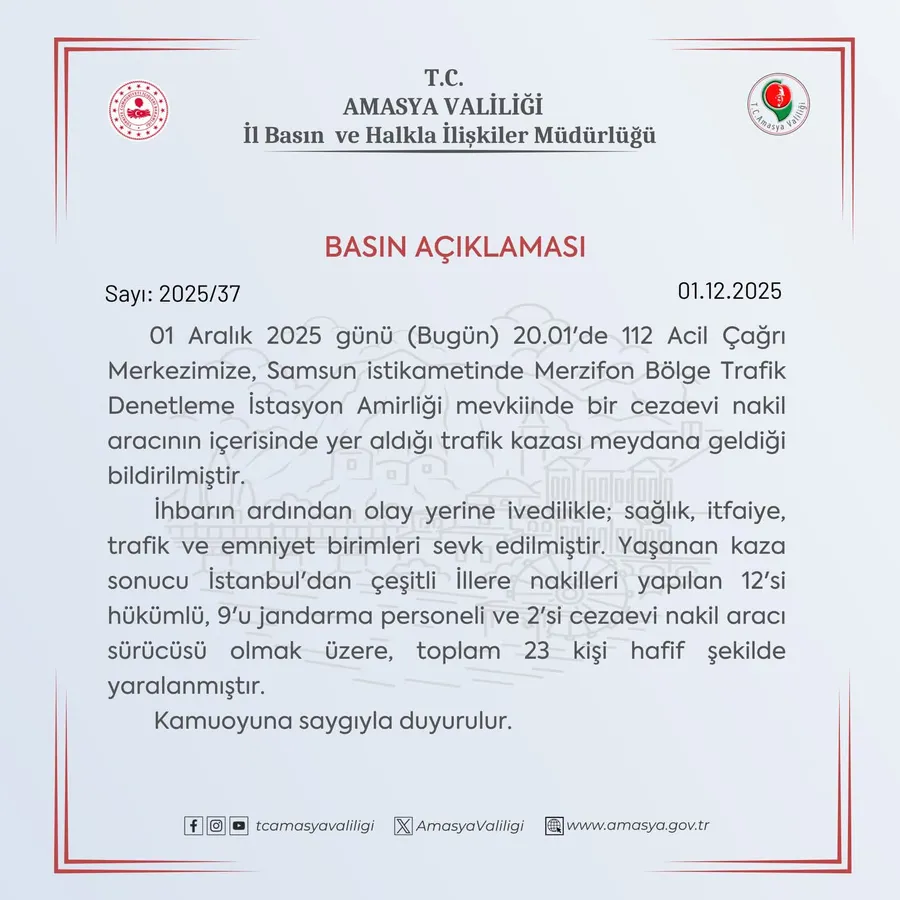 Valilikten yapılan açıklamada, “Merkezimize, Samsun istikametinde Merzifon Bölge Trafik Denetleme İstasyon Amirliği mevkiinde bir cezaevi nakil aracının içerisinde yer aldığı trafik kazası meydana geldiği bildirilmiştir. İhbarın ardından olay yerine ivedilikle; sağlık, itfaiye, trafik ve emniyet birimleri sevk edilmiştir” denildi.
