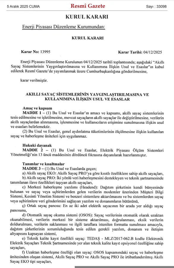 (TBA) 5 Aralık 2025 tarihli Resmi Gazete’de yayımlanan kararla, ülke genelindeki tüm elektrik sayaçlarının 2028 yılına kadar akıllı sayaçlarla değiştirilmesi zorunlu hale geldi.