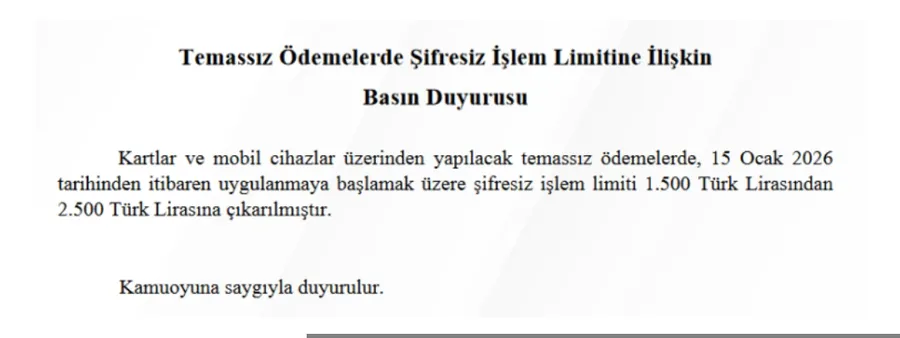 Yapılan açıklamaya göre, kartlar ve mobil cihazlar üzerinden gerçekleştirilen temassız ödemelerde geçerli olan şifresiz işlem limiti, 15 Ocak 2026 tarihi itibarıyla 1.500 TL’den 2.500 TL’ye yükseltileceği duyuruldu.