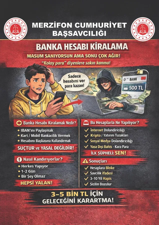 Başsavcılık, “Masum gibi görünen büyük tehlike” başlığıyla hesap kiralamanın yasal değil suç işlenecek bir girişim olduğunu vurguladı. Başsavcılık tarafından kamuoyunu bilgilendirmek amacıyla yapılan açıklamanın tamamı şu şekilde: