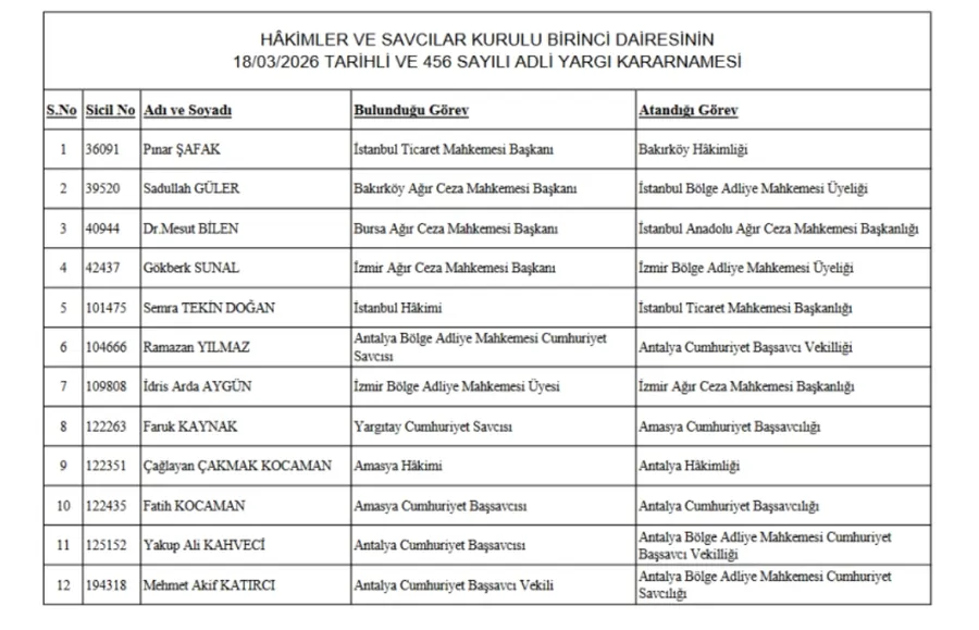 Hakimler ve Savcılar Kurulu (HSK) Birinci Dairesi tarafından 18 Mart 2026 tarihinde yayımlanan kararname ile adli teşkilatta önemli görev değişiklikleri yapıldı.